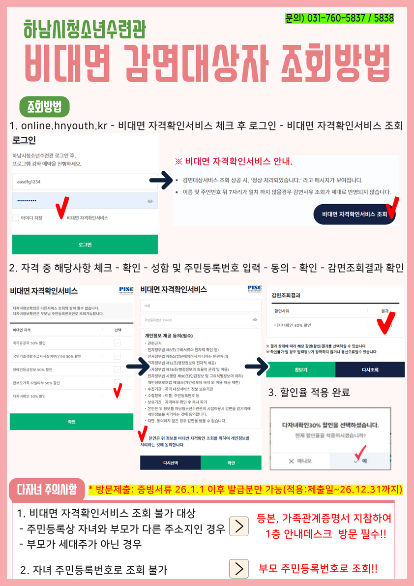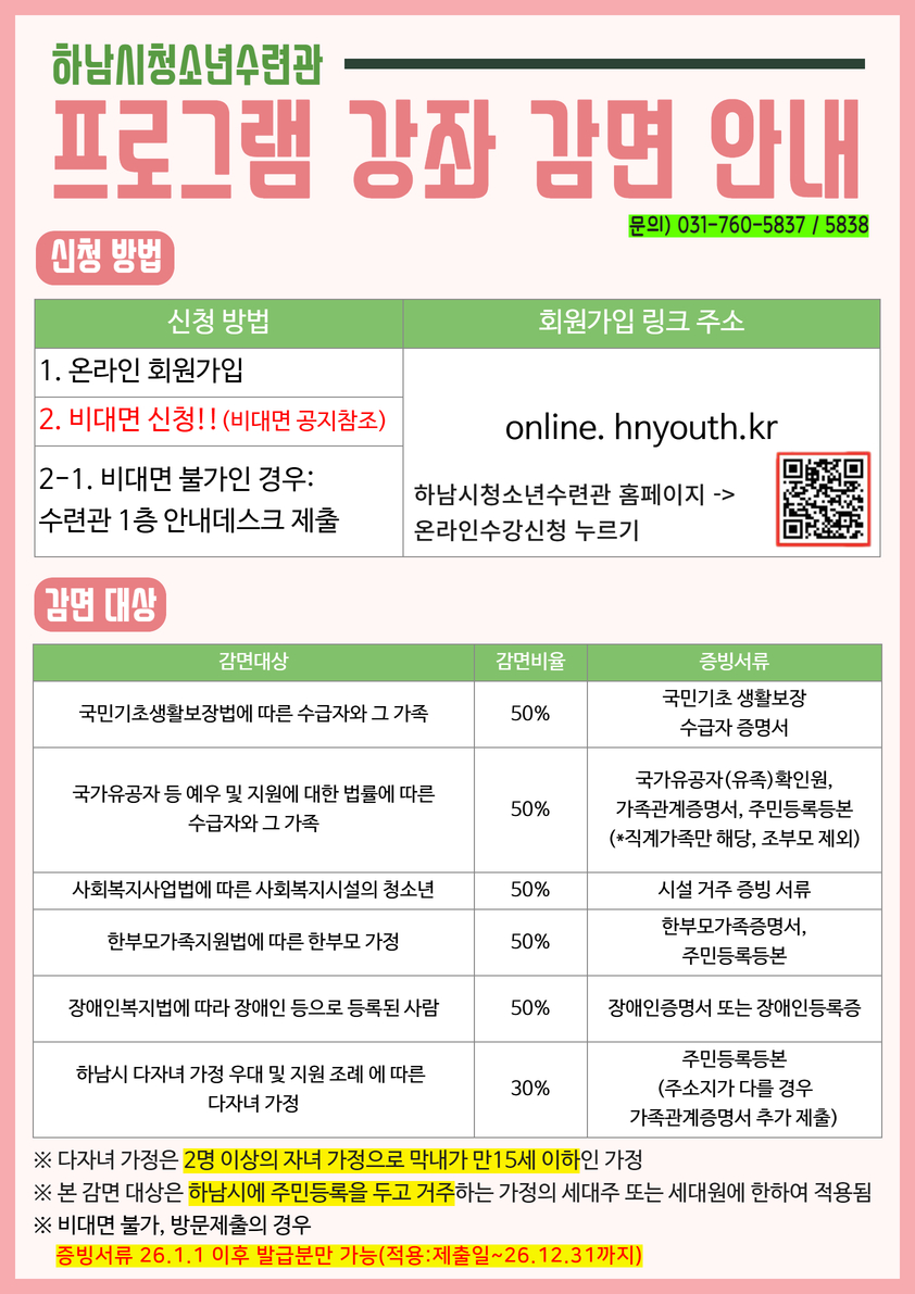 2026년 강좌 및 이용료 감면 안내드립니다. (감면 문의: 031-760-5837 / 031-760-5838)