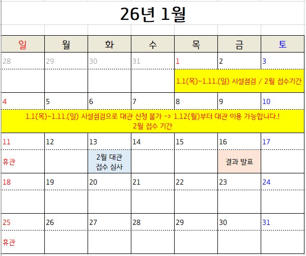 ** 1.1(월)~1.11(일)은 시설 점검으로 대관 불가능한 일자?**