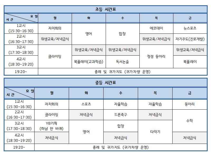 프로그램 : 교과학습(영어, 수학)·디지털(드론축구,AI웹툰교육)·스포츠(클라이밍, 뉴스포츠)·캠프· 예술교육(합창,타악기)·환경교육·주말특별체험(잡월드,롯데월드 등)·동아리(만들기,요리)·급식지원·귀가차량지원·상담 등