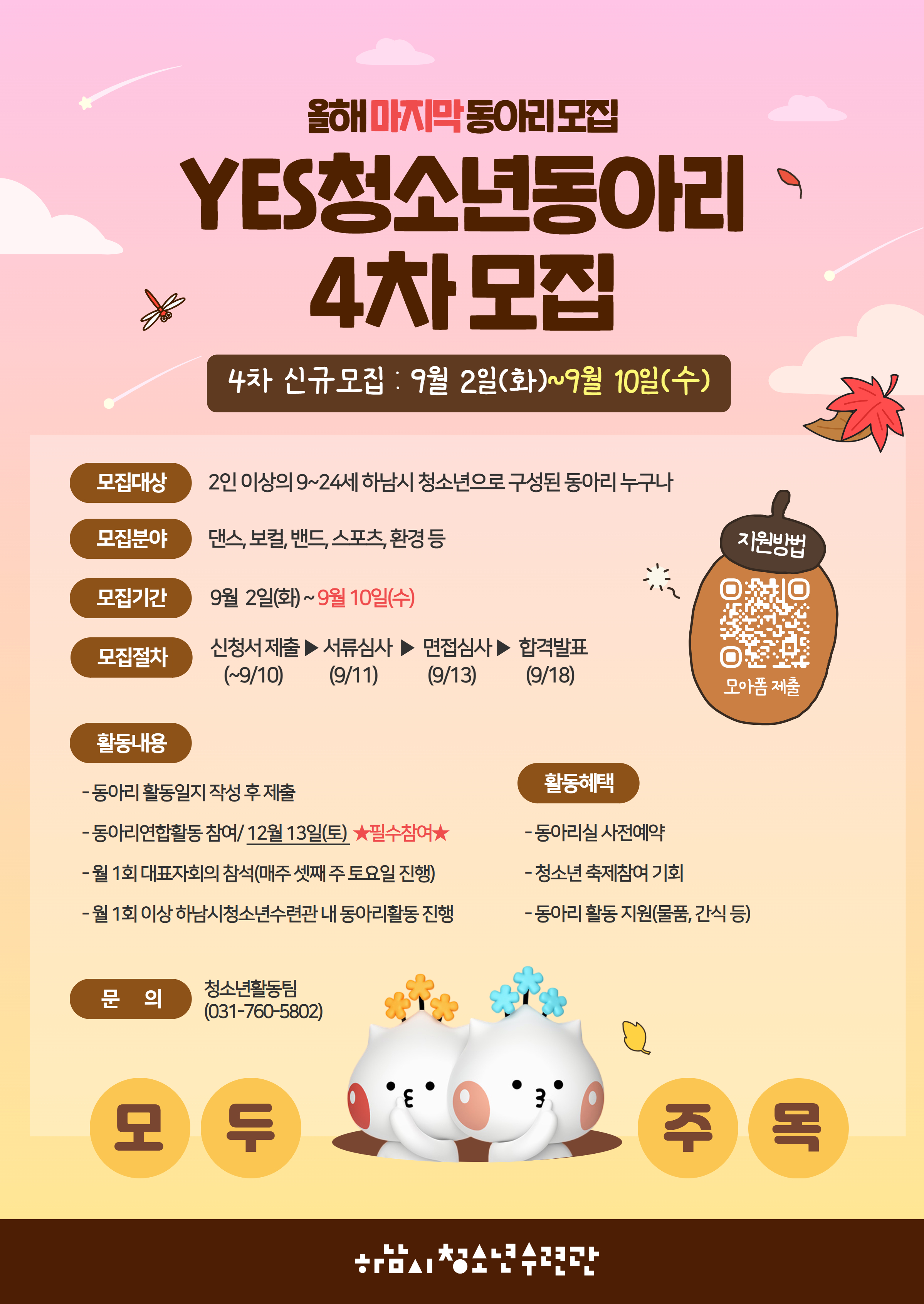 올해 마지막 YES청소년동아리 모집, 4차 모집을 진행합니다.