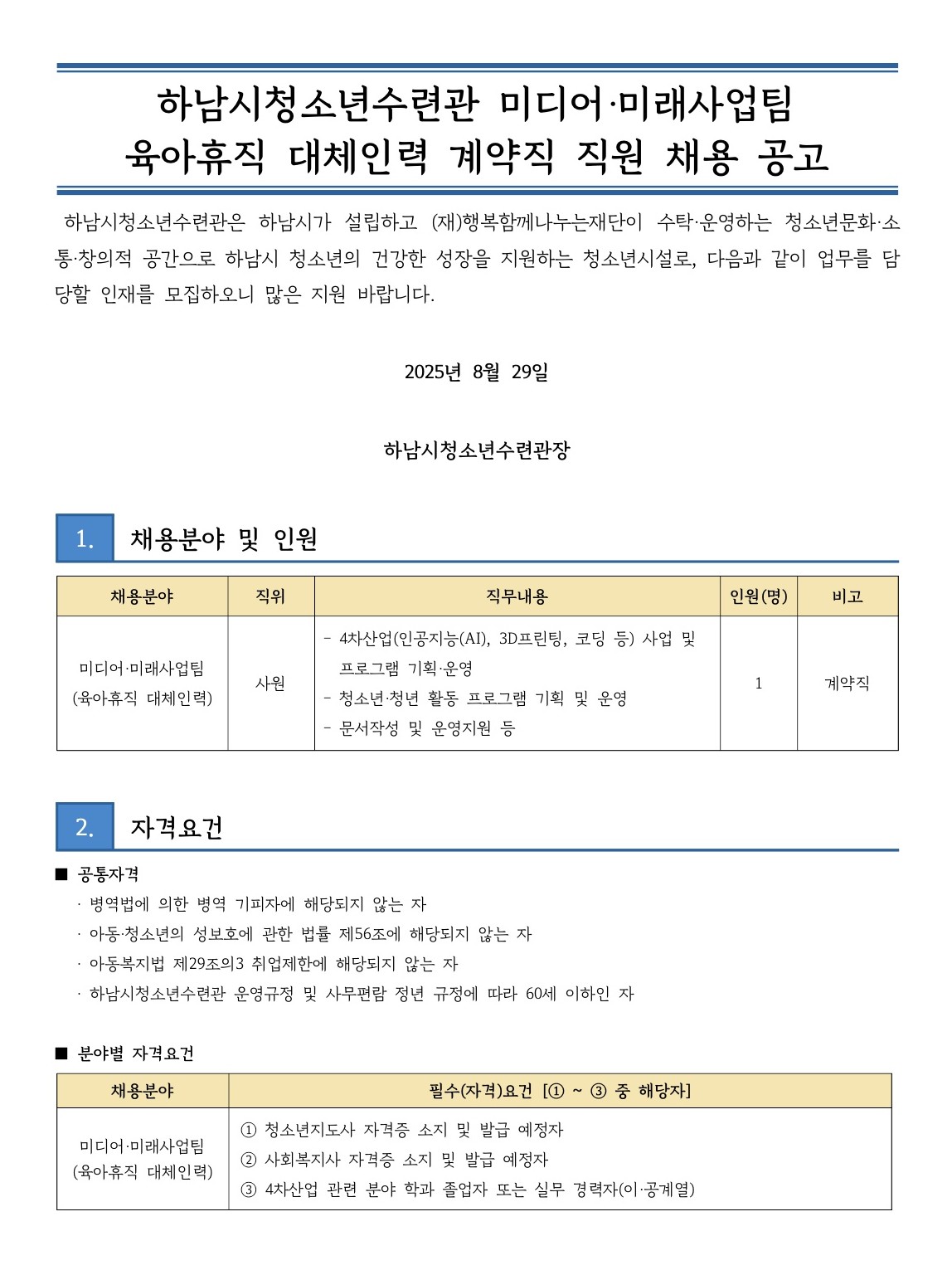 [마감] 하남시청소년수련관 미디어미래사업팀 육아휴직 대체인력 직원 채용 공고(~9/15(월) 09:00까지)