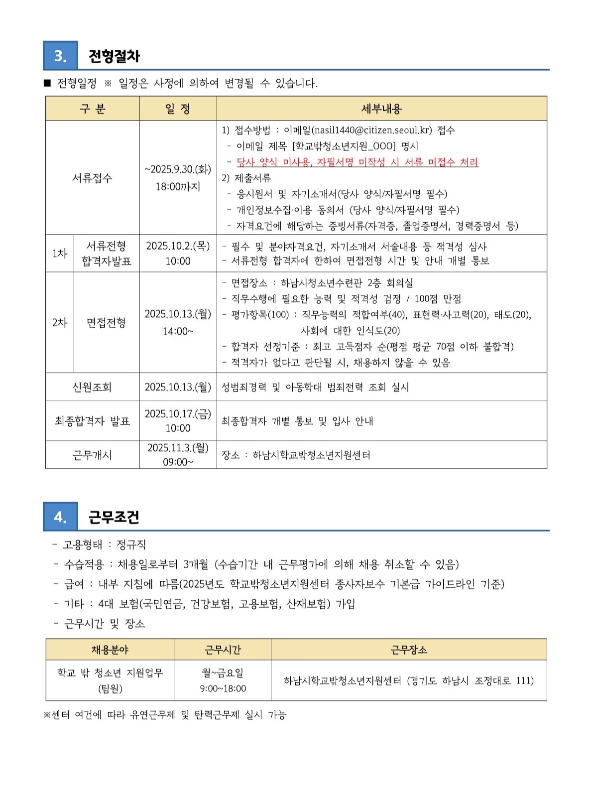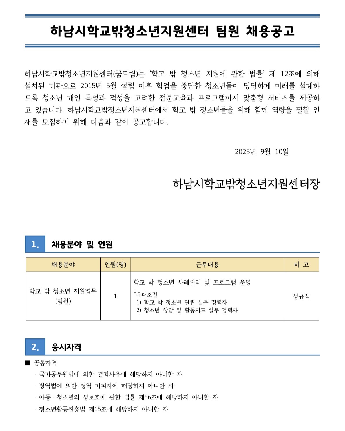 [채용] 하남시학교밖청소년지원센터 팀원 채용 공고(~9/30 18:00까지)