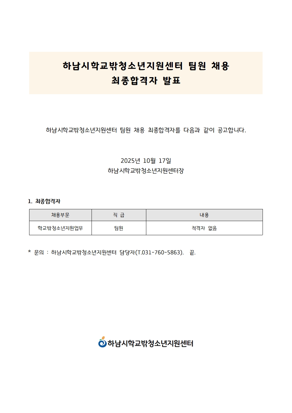 [발표] 하남시학교밖청소년지원센터 팀원 채용 최종합격자 발표