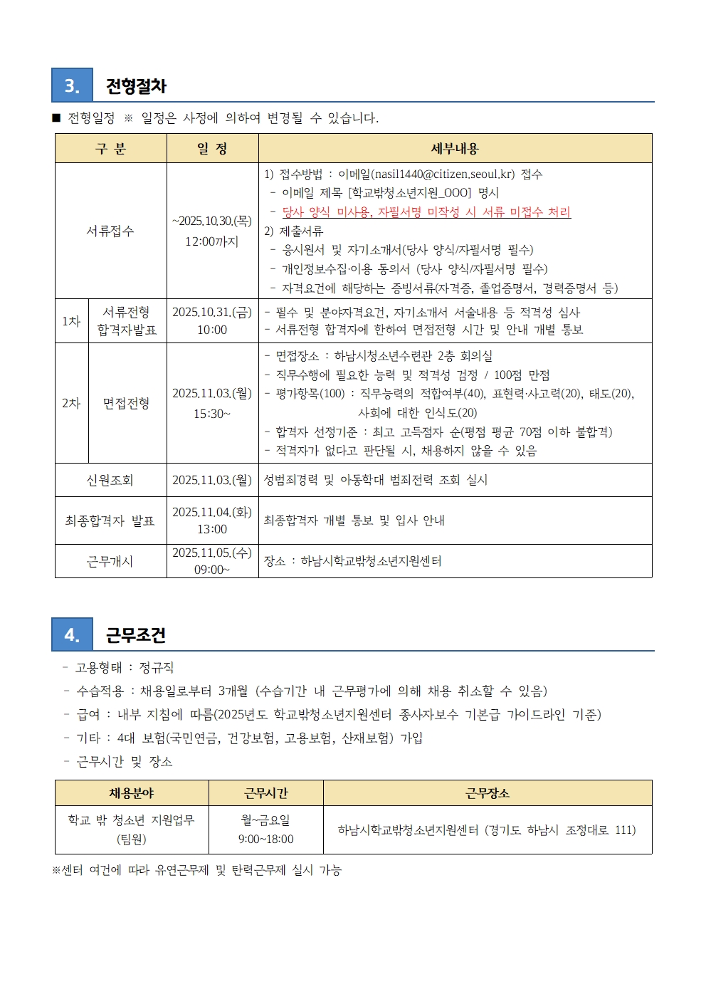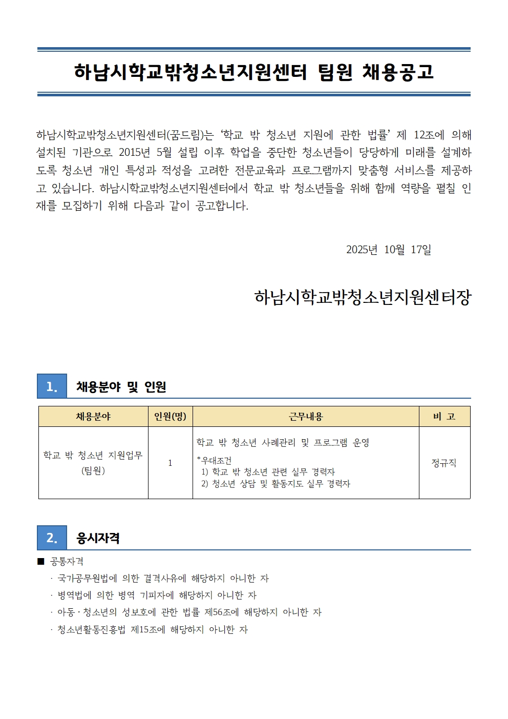[채용] 하남시학교밖청소년지원센터 팀원 채용 공고(~10.30. 12:00까지)