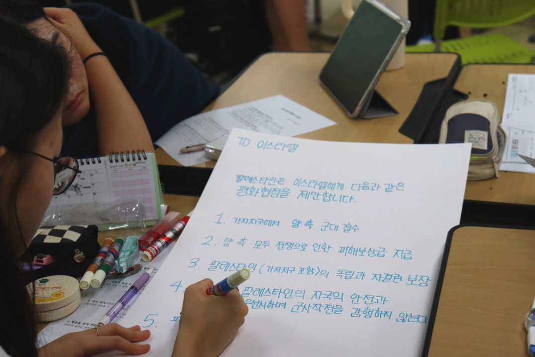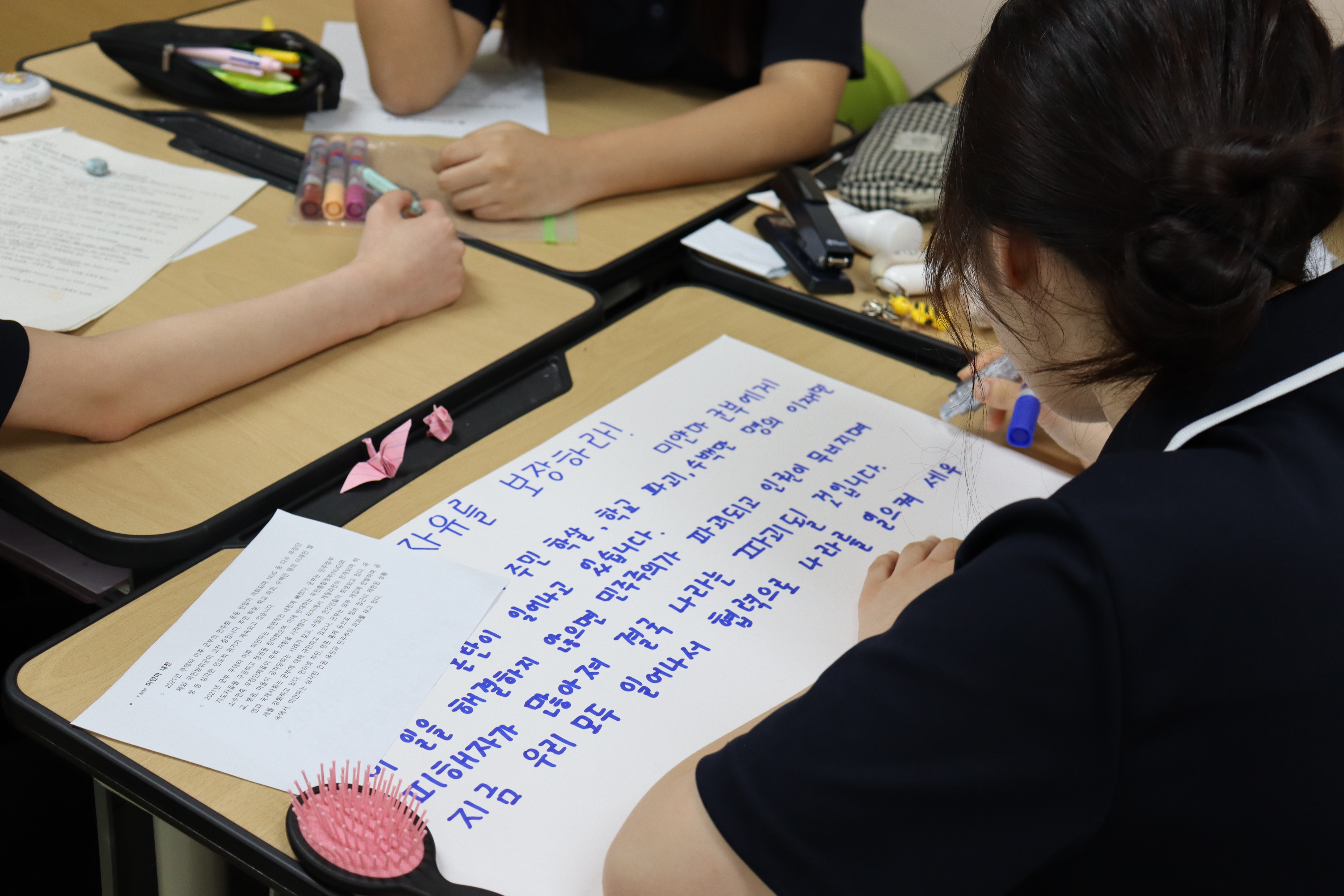 - 1학년: 전쟁을 통해 평화의 의미를 알아보고, 분쟁 국가의 입장에서 상대 국가에 평화를 제 안하는 편지 작성