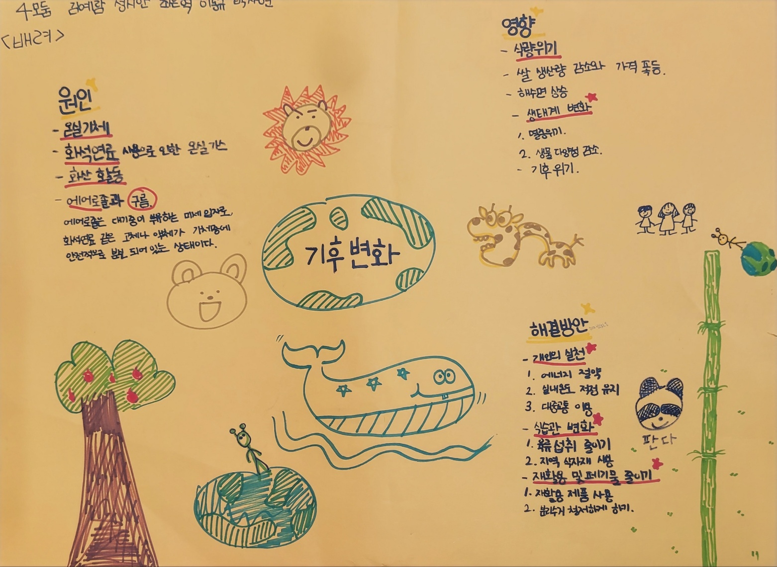 세 번째 시간에는 기후변화의 원인, 영향, 해결 방법을 담은 키워드맵을 완성하고, 조별로 발표를 진행했습니다.